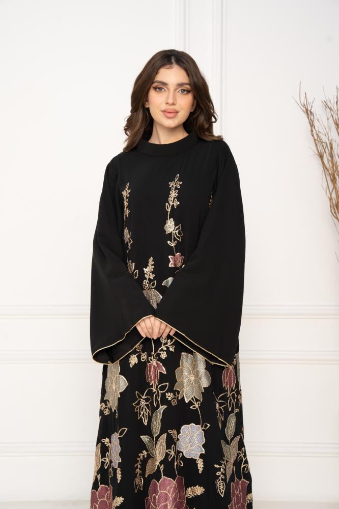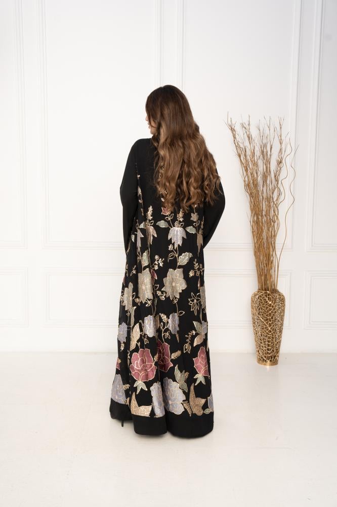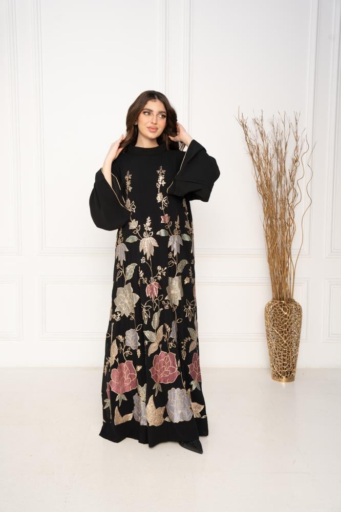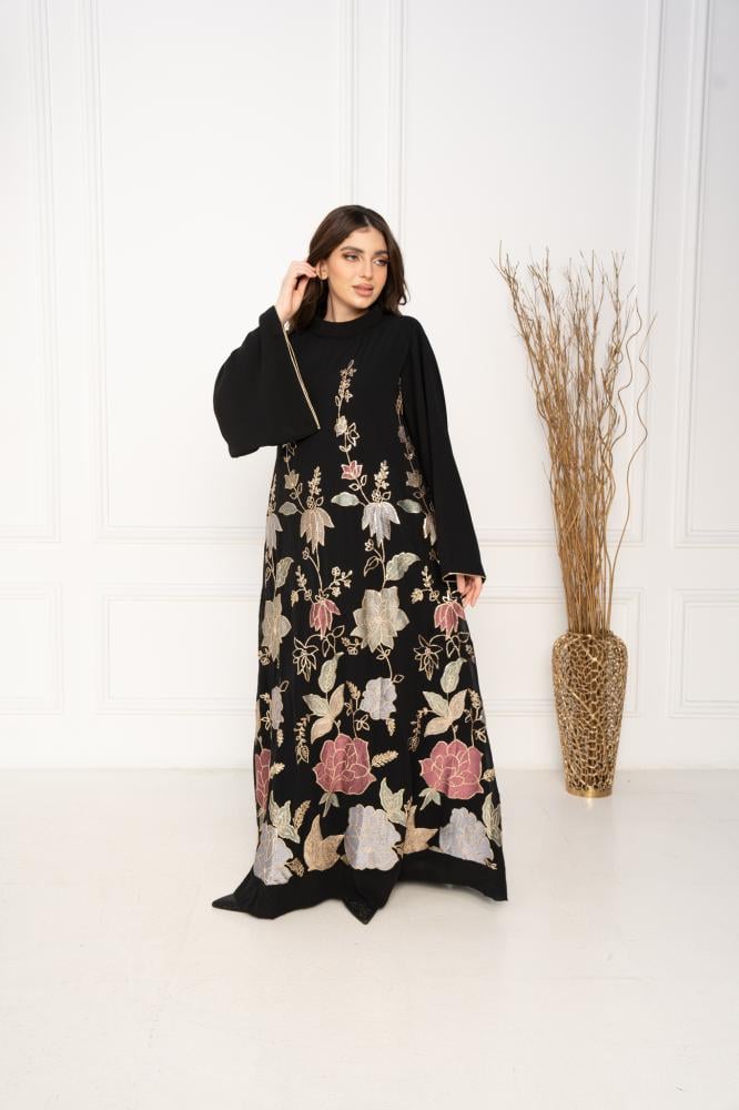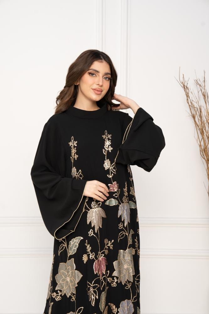 إنها جلابية كلاسيكية أنيقة بتصميم رائع. بلون أسود، تعطي هذه الجلابية إطلالة أنيقة وجذابة التطريز الذي يمتد من الأسفل إلى الصدر على شكل ورود باستخدام أجود الخيوط يعزز جمال التصميم ويضفي لمسة فنية على