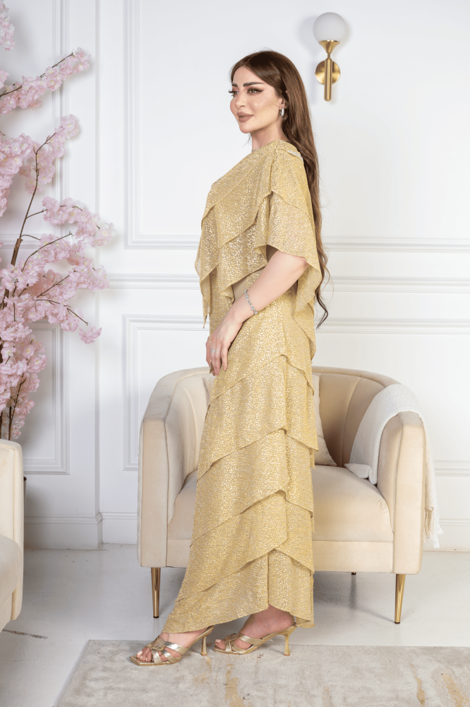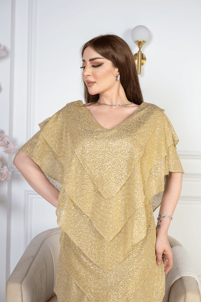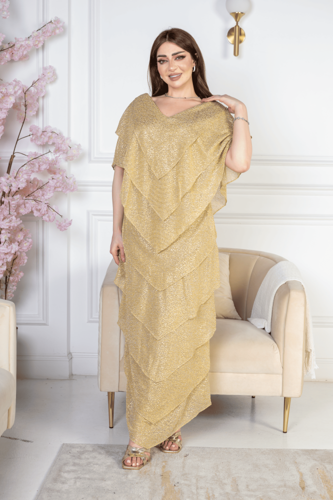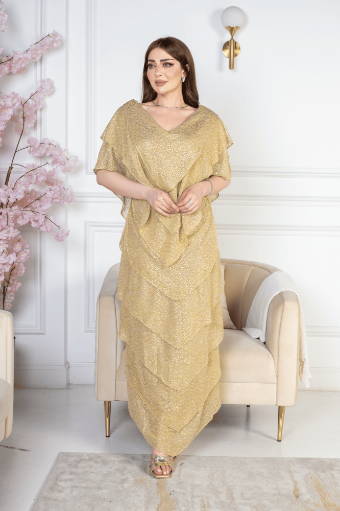 فستان “ذهب الليل” هو الخيار المثالي لكل من ترغب في التميز والتألق بإطلالة أنيقة وفاخرة. يأتي الفستان بلون ذهبي لامع يعكس الضوء بكل نعومة، مما يمنحك إطلالة براقة
