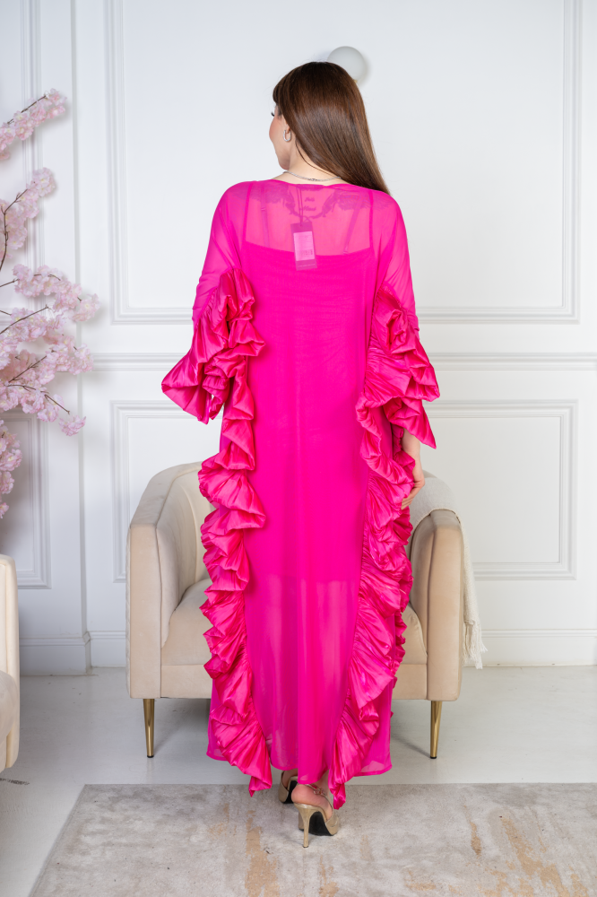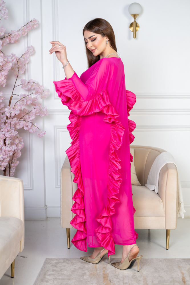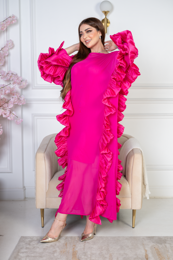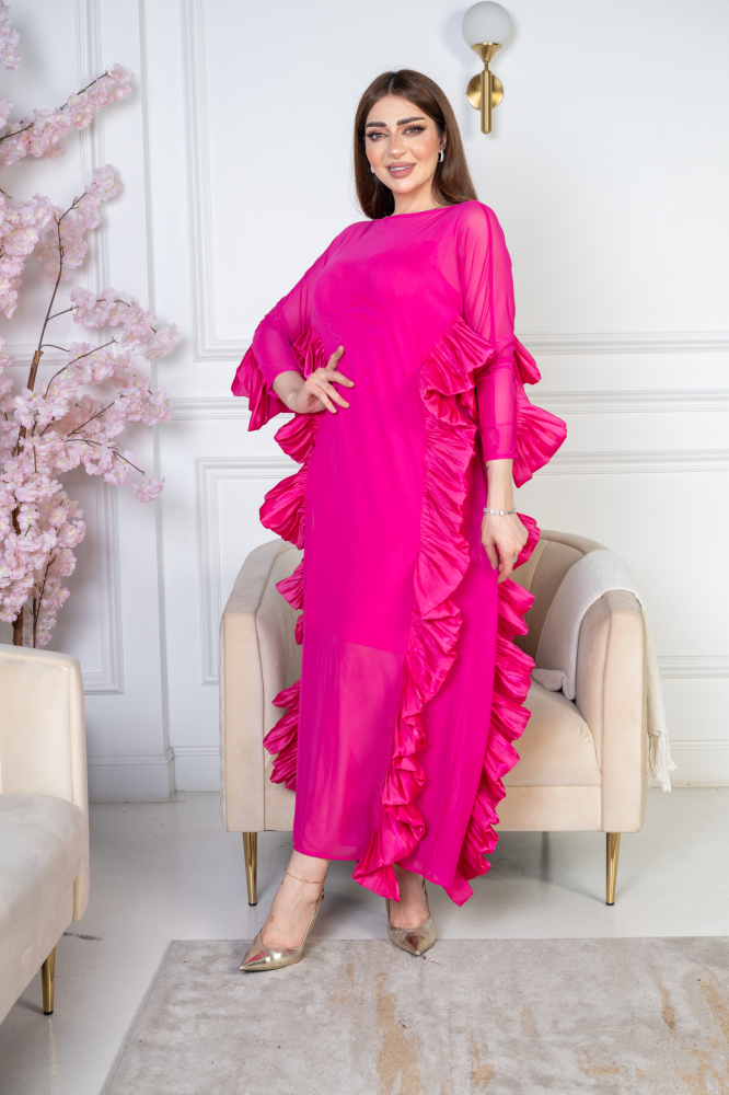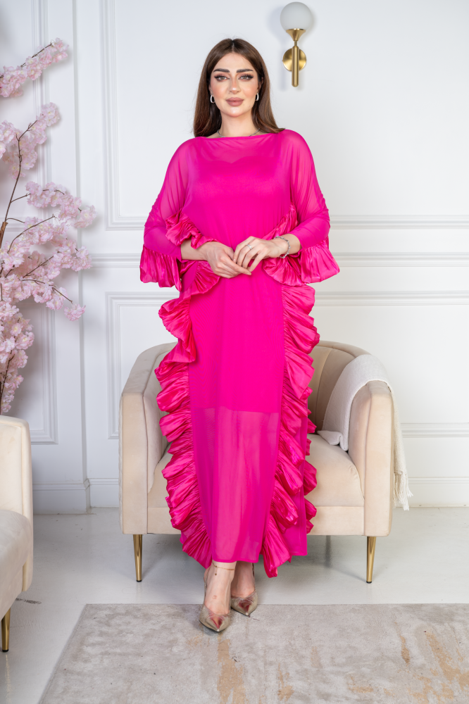 الفستان المثالي لكل امرأة تبحث عن الأناقة والجاذبية، يتميز هذا الفستان بلونه الوردي الفاتح الذي يضفي لمسة من التألق، بينما تضفي تفاصيل الكشكش على الأكتاف والجوانب رونقاً عصريًا وأنثويًا